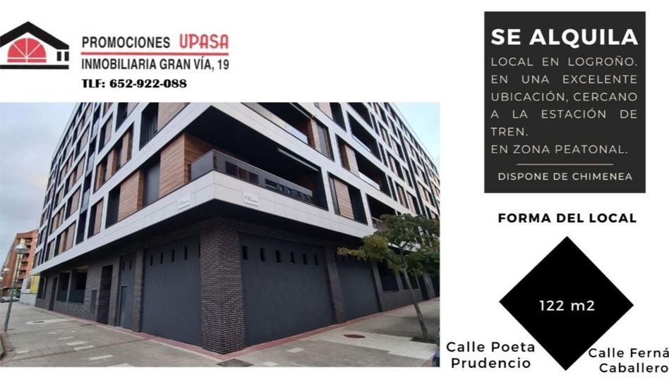 Se alquila amplio local de obra nueva en una de las mejores zonas de Logroño, ubicado en el corazón de Cascajos, junto a la Plaza Clara Campoamor y en zona peatonal. Hace esquina con las calles Poeta Prudencio y Fernán Caballero, muy cerca de la estación de tren y autobuses, lo que le aporta gran visibilidad y tránsito peatonal.