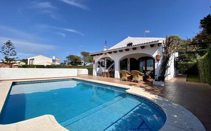 Preciosa villa de 140 m² situada sobre una parcela de 400 m² ubicada en Cala'n Bruch, a 6 kilómetros de Ciutadella de Menorca. Se encuentra en una zona residencial a tan solo 100 metros de la playa. La vivienda se distribuye en una sola planta y ofrece un dormitorio con baño privado y dos dormitorios dobles que comparten un baño, una cocina, un lavadero y un salón-comedor con salida a un porche-terraza de 20 m². También consta de un trastero, un garaje y un cuarto de máquinas. Además, disfruta de una bonita piscina ideal para relajarse. La villa se alquila por meses completos. Póngase en contacto con nosotros para más información.