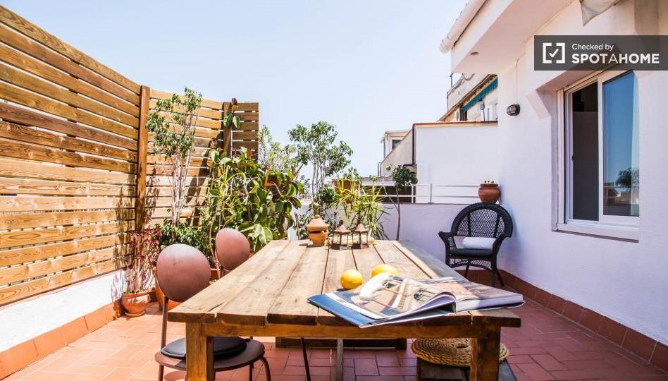 Este hermoso apartamento de 3 dormitorios y 2 baños está situado en la calle Garcilaso, en el barrio de Horta Guinardo, y cuenta con un fabuloso patio en la azotea. Este piso es precioso por dentro; Y confía en nosotros, te quedarás impresionado por esta terraza! Alineadas con plantas en maceta y amuebladas con muebles de patio, estamos seguros de que disfrutará de muchas buenas comidas y bebidas aquí y bajo el sol de Barcelona. Dentro del apartamento, usted puede disfrutar de las comodidades nuevas y renovadas. La distribución de 2 pisos del apartamento da una sensación de intimidad a cada habitación. Este apartamento sería perfecto para un grupo de amigos que se trasladan a Barcelona juntos o una familia en busca de una casa elegante, pero totalmente equipada para explorar la Ciutat Comtal!