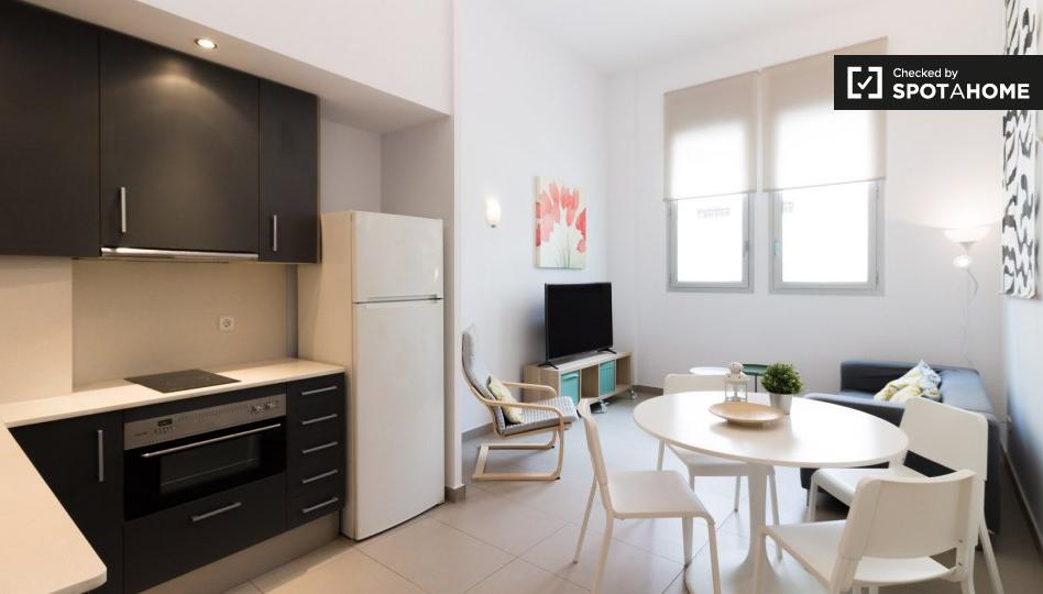 Spotahome ofrece un apartamento interior amueblado de 1 dormitorio en Vila de Gràcia, Barcelona. El apartamento cuenta con aire acondicionado central, lavadora, cocina equipada y balcón. No se admiten animales ni fumadores, y es ideal para profesionales, parejas y estudiantes. Se admiten invitados y Spotahome inspecciona cuidadosamente la propiedad. El alquiler no incluye agua, electricidad, gas ni internet; estos gastos se facturan aparte por el propietario.