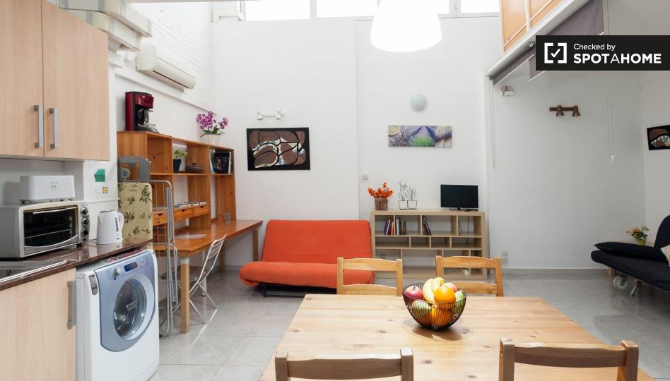 Este es un acogedor estudio en Sant Martí, justo en el corazón de Barcelona. Equipado con todo lo que necesita: un montón de espacio para sentarse, cocina, aire acondicionado para los veranos calurosos españoles, realmente lo tiene todo aquí.