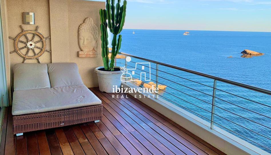 Exclusivo piso en primera línea de mar con impresionantes vistas a Formentera. 120m² distribuidos en 2 dormitorios, 2 baños, amplio salón con cocina americana. Disfruta de una terraza de 20m² para relajarte frente al mar. Incluye 2 plazas de parking.