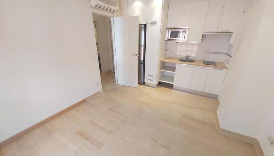 La vivienda se sitúa en una tercera planta exterior con ascensor, consta de 48 m² distribuidos en recibidor, un baño totalmente equipado con plato de ducha, un dormitorio con armario empotrado y ventana, y un gran salón comedor con ventanal a la calle San Bernardo y una cocina americana equipada con placa vitrocerámica, nevera, lavadora y microondas.