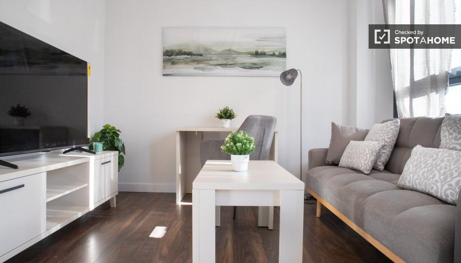 Este encantador apartamento de una habitación en alquiler se encuentra en la vibrante zona de Legazpi, Madrid. El apartamento luce un diseño contemporáneo con muebles modernos y cuenta con cocina totalmente equipada, balcón y aire acondicionado central. La cocina incluye electrodomésticos esenciales como horno, lavavajillas y lavadora, lo que garantiza comodidad y conveniencia. El edificio dispone de ascensor para facilitar el acceso y es ideal para diversos tipos de inquilinos, como profesionales, parejas, estudiantes y estudiantes Erasmus. Spotahome ha revisado personalmente esta propiedad para garantizar su calidad.