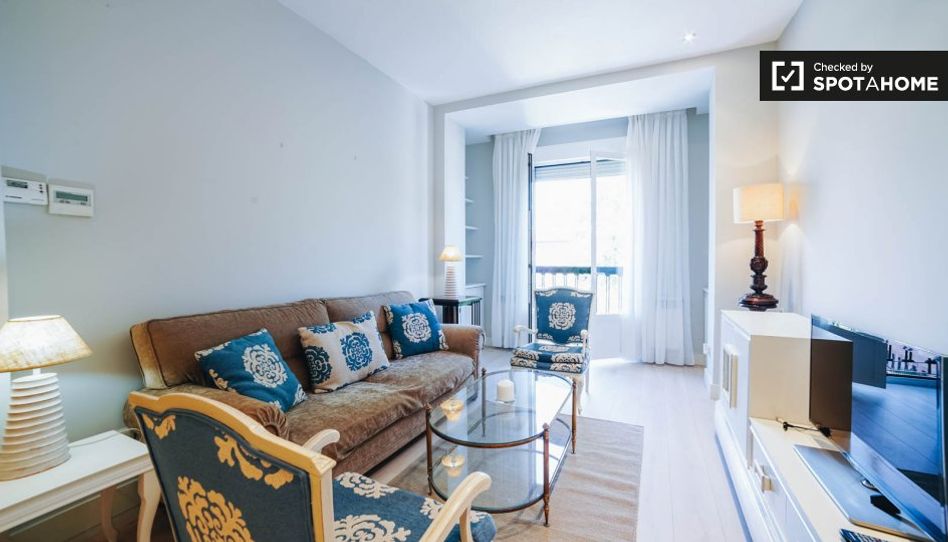 Este apartamento de 1 dormitorio disponible para alquilar en La Latina es una propiedad muy elegante de 80 m². Tanto la sala como el dormitorio se abren a balcones que dan a la calle y que los mantienen frescos y frescos. La sala de estar tiene un gran sofá cómodo, una decoración elegante, una mesa de comedor y un televisor de pantalla plana. La cocina es compacta pero tiene todos los electrodomésticos modernos, incluyendo un lavavajillas y una lavadora.
