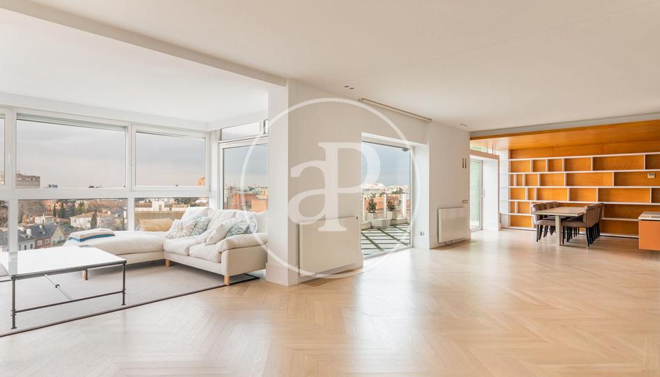 Exclusivo ático de lujo de 302 m2 con reforma integral. Desde la entrada accedemos a un pasillo distribuidor con armarios gabaneros y un aseo de cortesía. El salón comedor, de gran tamaño, con grandes ventanales de suelo a techo, orientación sur y acceso directo a la terraza de 30 m2 con vistas a todo Madrid. Cuenta con chimenea de gas haciendo la estancia más agradable. El comedor se comunica con la cocina, completamente equipada con todos los electrodomésticos de gama alta, además de ser muy amplia y con gran capacidad de almacenamiento. El lavadero se encuentra en la zona de servicio con lavadora y secadora, además de puerta de servicio. Desde el pasillo distribuidor se accede a la zona de noche El principal tiene un amplio vestidor y cuarto de baño en suite con plato de ducha. Luego hay dos dormitorios más uno con baño en suite con bañera y otro con el cuarto de baño en el pasillo y con plato de ducha. El dormitorio de servicio con su cuarto de baño está junto a la entrada de servicio. La vivienda tiene muchos armarios y la calefacción por radiadores es central. La vivienda cuenta con aire acondicionado. Además, se incluye una plaza de garaje. La finca cuenta con conserje. Ubicación privilegiada, en una de las mejores calles de El Viso, con gran variedad de servicios, colegios de prestigio, restaurantes, metro en la puerta y varios autobuses.