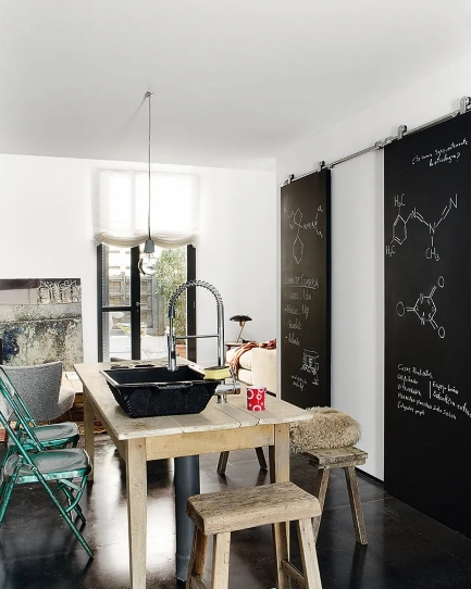 En la despensa, encontramos una cajonera de hierro y cubos recuperados de una fábrica, con una puerta acabada en efecto pizarra.