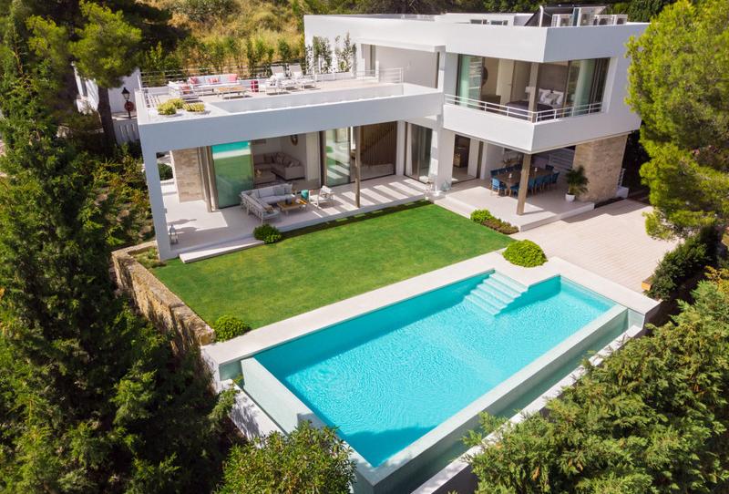 Impresionante villa de 4 dormitorios idealmente ubicada en el corazón del Valle del Golf de Nueva Andalucía. Recién construido y amueblado a un alto nivel de lujo, esta fantástica propiedad está seguro de cumplir y superar las expectativas de los huéspedes. Distribuida en 3 plantas, la villa ofrece 4 dormitorios, una sala de cine, bodega, salón interior y exterior sin fisuras, terraza en la azotea, cocina abierta de alta gama, barbacoa de gas y piscina privada.