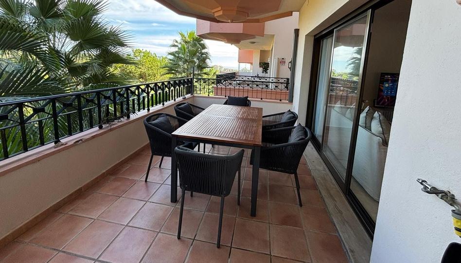 La terraza principal, conectada al salón y a la suite principal, funciona como un auténtico salón al aire libre: zona chill out con sofás, gran mesa comedor y vistas abiertas al mar y al campo de golf, junto al conocido Río Real Golf Club.