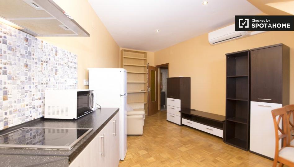 ¿Te mudas a Madrid, pero quieres una experiencia más residencial? ¡Considere este apartamento de 1 dormitorio en alquiler en la calle Juan Pablo II en Pozuelo de Alarcón! La sala de estar cuenta con un sofá encantador y cómodo y una cómoda estantería donde puede guardar libros y otros artículos. El dormitorio tiene una cama doble y permite parejas. El baño tiene un buen inodoro, ducha y lavabo.