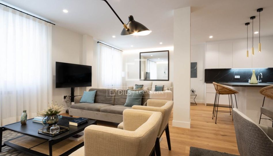 Un piso precioso, elegante, y con reforma completa de muy alta calidad. Ubicado en la calle Castelló, en el corazón del Barrio de Salamanca a escasos pasos del parque El Retiro, una de las zonas más exclusivas y comerciales de la ciudad, con mucha vida auténtica madrileña. La decoración es moderna, cuidando todos los detalles, colores y espacios para crear un ambiente muy agradable. Es interior con ventanas a un patio interno, por lo que es muy tranquilo. Al entrar se abre un pasillo con cuadros de gran fornato, donde a la izquierda están las dos habitaciones secundarias y el segundo baño, a la derecha una ventana y el cuarto de lavado, y al fondo está el salón / comedor / cocina integrada y la habitación principal con su baño en suite. El salón tiene un sofá de 3 plazas en piel gris oscura con dos poltronas en blanco, mesillas de centro, un mueble con una smart TV de gran formato en la pared, alfombra, y cuadros y plantas decorativas. El comedor cuenta con mesa rectangular en blanco con 6 sillas en tela gris claro y una lámpara moderna que le brinda mucha luz. Hay un gran espejo que adorna el ambiente y refleja la luz que entra por las ventanas. La cocina está a la izquierda del salón en tonalidades grises / crema con piedra, muy moderna, totalmente equipada con todo lo necesario, espacio para almacenaje, menaje de cocina completo para 8 personas y artefactos de alta gama. Cuenta con un mesón con 2 sillas altas en tela blanca. La habitación principal está a la izquierda del salón y se accede mediante una puerta corrediza. Tiene una cama de 1.80 con canapé, mesillas laterales en madera, TV grande en la pared, armarios empotrados en el pasillo hacia el baño amplio en suite con 2 lavamanos y plato de ducha con cabina de cristal. Volviendo al pasillo de entrada tenemos el segundo baño, muy amplio con plato de ducha y cabina de cristal. Frente a este baño está el cuarto de lavado con la lavadora / secadora, termo eléctrico de agua, utensilios de limpieza y espacio de almacenaje. Seguidamente están las dos habitaciones secundarias, la primera con cama doble de 1.60 con canapé, un pequeño escritorio y su mesilla de noche. La segunda con dos camas individuales de 0.90 con canapé. Ambas habitaciones cuentan con TV en la pared, armarios empotrados y ventanas a un patio interno. El edificio tiene portero físico y ascensor. Todas las habitaciones cuentan con persianas eléctricas.