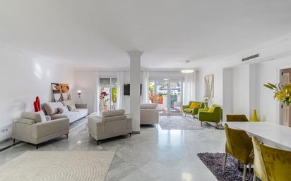 Situado en la prestigiosa y consolidada urbanización Monte Paraíso, en plena Milla de Oro de Marbella, este elegante apartamento en planta baja ofrece una excelente combinación de amplitud, privacidad y estilo de vida exclusivo, a pocos minutos de la playa, del centro de Marbella y de todos los servicios. La vivienda cuenta con 167 m2 construidos, distribuidos en tres amplios dormitorios y dos baños. El salón-comedor, luminoso y acogedor, se abre directamente a una gran terraza cubierta, ideal para disfrutar de comidas al aire libre y momentos de descanso, con agradables vistas a los jardines comunitarios perfectamente cuidados. Uno de los dormitorios dispone además de acceso directo a una segunda terraza, reforzando la conexión entre los espacios interiores y exteriores. El apartamento se presenta en excelente estado, con suelos de mármol, aire acondicionado frío/calor, armarios empotrados y una cocina moderna totalmente equipada, que incluye zona de lavandería independiente. La distribución es funcional y cómoda, con abundante luz natural en todas las estancias. Monte Paraíso es una urbanización cerrada de alto nivel, reconocida por su seguridad 24 horas, amplias zonas ajardinadas y piscinas comunitarias, ofreciendo un entorno tranquilo, seguro y exclusivo en una de las ubicaciones más demandadas de Marbella. Características adicionales: 2 plazas de garaje subterráneo Trastero Aire acondicionado frío/calor Terraza principal + terraza secundaria Urbanización cerrada con vigilancia 24h Se admiten mascotas A poca distancia de tiendas, restaurantes Una propiedad ideal para familias o profesionales que buscan un hogar refinado y confortable en una de las mejores zonas residenciales de la Costa del Sol.