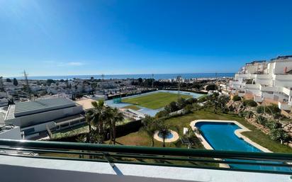 Ático con vistas al mar Nerja de 100m2 con terraza de 17m2 en la misma planta y terraza solárium de 77m2 en planta superior. Edificio con ascensor aunque a la terraza solárium se accede mediante escaleras. Está totalmente amueblado y con todo lo necesario para entrar a vivir. Piscina comunitaria abierta del 1 de junio al 30 de octubre Disponible para largas temporadas a partir de Septiembre Dispone de 3 dormitorios, 2 baños, salón-comedor, cocina equipada, amueblado, terraza, solárium vistas al mar, garaje y piscina.
