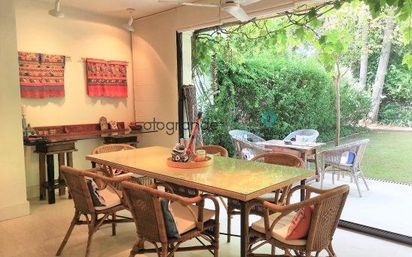 Disponible para alquiler de corta estancia todo el año, y alquiler de larga estancia sólo entre septiembre y junio. Precio a consultar según fechas y estancia. Preciosa casa adosada con jardín maduro muy privado en la conocida urbanización de La Loma en Sotogrande Costa. La urbanización cuenta con amplias zonas verdes, piscina comunitaria y pista de tenis y de padel. La casa ha sido completamente reformada y se distribuye en planta baja con hall de entrada, amplio salón comedor con chimenea y salita de TV abierta al salón, terraza dando al jardín privado con césped y arboleda, un cuarto de baño con ducha, un dormitorio doble y una amplia y moderna cocina que da a un patio lavadero/tendedero. En la planta alta se encuentra el dormitorio principal con su cuarto de baño en suite y una terracita privada con vistas al jardín y 3 dormitorios dobles que comparten 1 cuarto de baño. Además en el exterior hay un trastero para bicis, motos, etc... Además cuenta con ventiladores de techo en todas las habitaciones, 2 termos eléctricos, 2 frigoríficos Miele, secadora, y está equipada para 10+ personas, todo ello en muy buenas condiciones y la casa tiene muy buen feeling, ideal para disfrutar en familia de tu propio espacio verde.