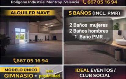 LISTA PARA EMPEZAR - NAVE CON LICENCIA CAFETERÍA + SALA POLIVALENTE Oportunidad real de negocio en Montroy (Valencia). Se alquila nave industrial con licencia de cafetería y uso polivalente, lista para empezar a trabajar sin trámites largos. 230 m² diáfanos 5 baños (incluido PMR) Patio exterior 75 m² Espacio adicional tipo oficina o cafetería Acceso directo Espacio ideal para desarrollar distintos modelos de negocio: fitness (adaptación), eventos, club social, coworking, formación, actividades, showroom, etc. Ubicación en Polígono Industrial Montroy, con fácil acceso y aparcamiento. 1.350 mes ATENCIÓN: NO RESPONDO NI VEO MENSAJES, SOLO WHATSAPP O TELÉFONO.