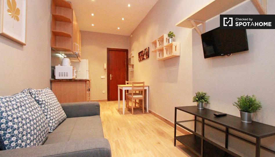 ¿Buscas un alojamiento acogedor y bien equipado para tu estancia en Barcelona? Este moderno apartamento de 1 dormitorio en el vibrante barrio de Hostafrancs podría ser la opción ideal. Totalmente amueblado para tu comodidad, cuenta con lavadora, TV y cocina totalmente equipada con horno. Con wifi incluido, estar conectado nunca será un problema. Parejas, estudiantes y profesionales son bienvenidos. No se permite fumar ni se admiten mascotas. Este apartamento ha sido verificado personalmente por Spotahome, lo que garantiza la calidad y precisión de su anuncio.