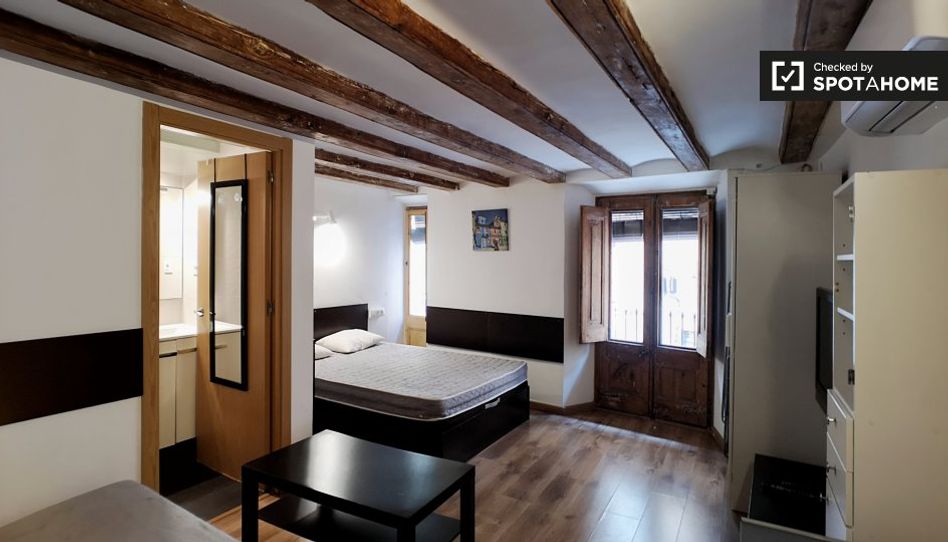 Este encantador estudio independiente en El Raval, Barcelona, está disponible para alquilar. Ideal para parejas, se entrega completamente amueblado y equipado, incluyendo lavadora privada y aire acondicionado central. La cocina está totalmente equipada para que puedas cocinar a gusto, y además, la propiedad cuenta con balcón o terraza. El WiFi está incluido para que disfrutes de una excelente conexión. Spotahome ha revisado personalmente esta propiedad para tu tranquilidad. No se admiten mascotas ni fumar.