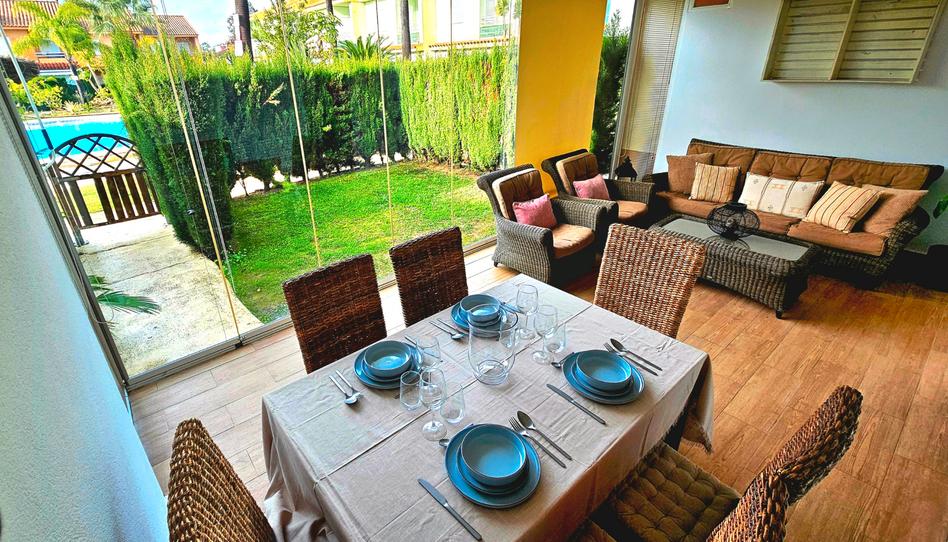 En la exclusiva y tranquila zona residencial de Islantilla Golf, rodeado de campos y hoyos, cerca del Club de Golf, se encuentra esta casa adosada de 3 dormitorios, 2 baños y aseo, con capacidad máxima para 10 personas, que cuenta con chimenea, porche acristalado, pequeño jardín privado, zonas comunes con jardines y piscina. La casa dispone de mobiliario nuevo de diseño, con tv plana de 50". La cocina totalmente equipada con todos los electrodomésticos y lavadero. La playa se encuentra a unos 800 metros y en verano tiene un supermercado justo en frente de la urbanización. Con parking privado, se admiten mascotas.