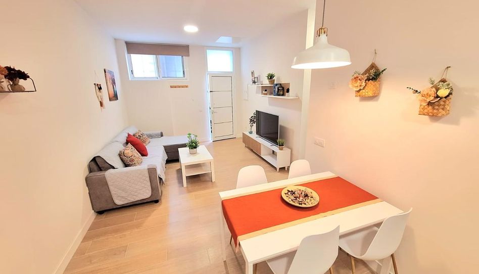 Accedemos a pie de calle a la vivienda y nos encontramos con un amplio salón, luminoso y cómodo, equipado con un sofá chaise longue y una moderna cocina completamente equipada, que incluye una mesa para cuatro comensales. Todo ello decorado en colores cálidos, perfectos para disfrutar de momentos de relax en este espacio.
