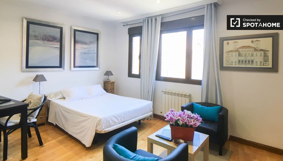 Este elegante estudio de 3er piso disponible para alquilar en el área de Retiro es ideal para una persona o pareja. La habitación principal tiene grandes ventanas que la mantienen fresca y soleada, y está muy bien decorada. La decoración es elegante y práctica con una cama doble, sillones pequeños y mesa de comedor para 2 personas. La cocina está totalmente equipada y hay un baño moderno y espacioso.