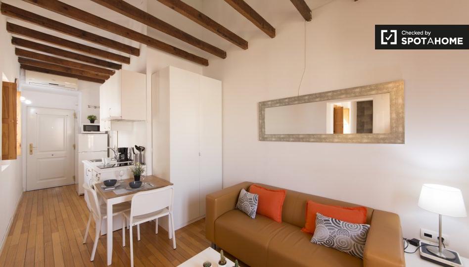 ** El lindo y acogedor ** _Porque me encanta un lugar cómodo para disfrutar del sol_ ** ¿Me gustará aquí? ** Sería difícil no hacerlo. ¿Buscas algo con mucho encanto y estilo, y mucho sol? Abre las puertas del balcón y toma el sol. **¿De Verdad? Dime más...** Te encantará este adorable espacio de estar con 2 pequeños balcones. Permiten que entre mucha luz natural y hagan que el espacio se sienta luminoso y aireado. Con techos altos y mucha luz, nunca se sentirá encerrado. Creemos que es ideal para alguien que busca un poco de vegetación cerca del centro. Encontrará el hermoso Parque de Casa de Campo a solo 15 minutos a pie, donde podrá disfrutar de paseos por el lago y excelentes vistas de la ciudad. ** Sus 3 razones principales para vivir aquí: ** - Este espacio tiene 2 balcones pequeños que dejan entrar mucha luz solar. - También está muy bien amueblado y muy moderno. - Estás a un paseo de la hermosa Casa de Campo. ** Pero necesitas saber esto ... ** - Este espacio no es enorme, al menos no necesitarás pasar mucho tiempo desempolvando. - Los balcones tampoco son enormes, y realmente no ofrecen ningún espacio para salir de ellos. **Y esto...** - Se permite fumar en este apartamento, pero solo en el balcón. - Se admiten mascotas pequeñas en este apartamento. Recuerde incluirlas en su solicitud de reserva. **Y esto también...** - No hay horno ni lavaplatos aquí - aspirantes a cocineros, cuidado. ** Tu verificador de casa, Pepa, dijo: ** _ \"Me encantó esta propiedad. Está bien conectado con el centro de la ciudad y se encuentra en una zona con muchos parques hermosos. Este es un espacio realmente lindo que también recibe mucha luz natural \". ** Ayúdame a decidirme ... ** Este es un lindo estudio en el cuarto piso, en la calle de Doña Urraca, Madrid. Cuenta con una sala de estar luminosa y soleada con 2 pequeños balcones y un estilo moderno. Esta propiedad es ideal para alguien que busca obtener un poco de naturaleza en su vida diaria. Te encantará estar a un paso de Casa de Campo. Los fumadores Disfrute en el balcón. ¿Dueño de la mascota? Trae a tus amigos peludos más pequeños.
