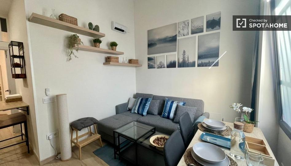 Este acogedor apartamento de 1 dormitorio en Ventas, Madrid, ofrece un ambiente acogedor con muebles completos, cocina equipada y aire acondicionado central. Ideal para parejas y estudiantes, y se admiten mascotas. La propiedad ha sido verificada personalmente por Spotahome, lo que garantiza la autenticidad del anuncio y ofrece tranquilidad al alquilar. Ubicado en la zona de Ventas, encontrará numerosos puntos de interés cercanos, como el restaurante \"Casa Paqui\", Burger Sus y el mercado del Día. Para visitar lugares de interés, la Tumba de Emma Penella y la Tumba de Tierno Galván son fácilmente accesibles. Esta ubicación combina comodidad y un estilo de vida vibrante en el centro de Madrid.