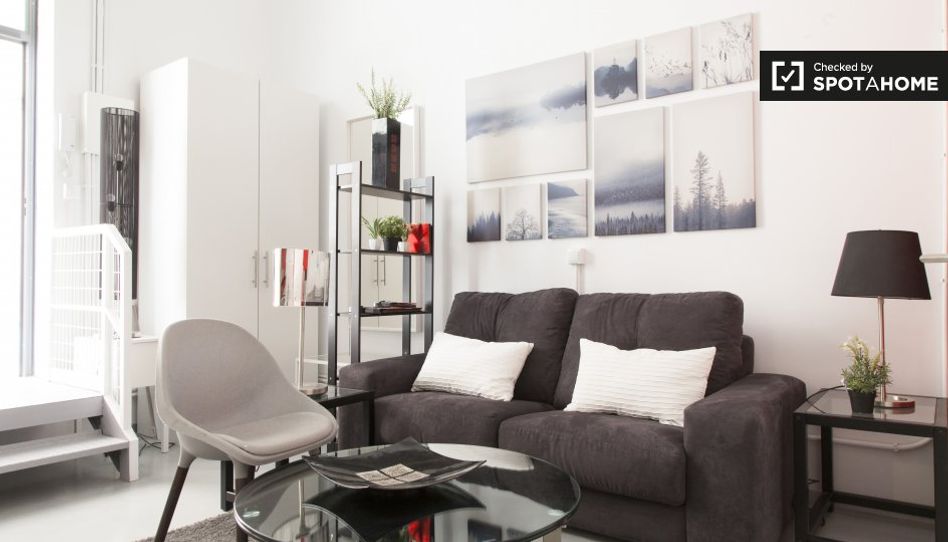 Esta es una hermosa planta baja, estudio en Travesía Vázquez de Mella, Madrid. Disfruta de este espacio moderno, con una hermosa cocina roja y aire acondicionado para mantenerte fresco y cómodo.