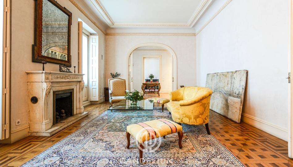 La vivienda conserva elementos originales de gran valor: siete chimeneas, suelos de madera noble con marquetería, vidrieras emplomadas y techos de 3,60 m con molduras decorativas. El portal, con suelo adoquinado de madera, es prácticamente único en Madrid.