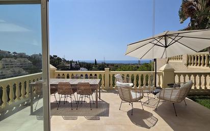 ADOSADO CON VISTAS AL MAR Y A LA MONTAÑA EN ELVIRIA – URBANIZACIÓN GRACE PARADISE Descubra el encanto del estilo de vida mediterráneo en esta preciosa casa adosada, situada en la tranquila Urbanización Grace Paradise en Elviria, a solo unos minutos de Greenlife Golf Marbella y Santa María Golf Club Marbella. Esta luminosa y amplia vivienda cuenta con 3 dormitorios y 3 baños, distribuidos en un diseño funcional pensado para ofrecer comodidad y estilo. Disfrute de las impresionantes vistas al mar y a la montaña desde sus 4 amplias terrazas privadas (una de ellas en la azotea) y de un jardín privado, ideales para relajarse, comer al aire libre o disfrutar del sol de la Costa del Sol. La planta principal se abre a una encantadora terraza que conecta directamente con el jardín y la piscina comunitaria. En la planta superior encontrará dos dormitorios con terraza y dos baños. La planta inferior ofrece un amplio estudio con cuatro camas, zona de estar, baño en suite y terraza privada. La propiedad dispone de una plaza de aparcamiento privada dentro de un complejo residencial tranquilo y bien cuidado. Con una ubicación ideal, cerca de campos de golf, playas y todos los servicios, esta propiedad combina tranquilidad, comodidad y elegancia costera — una opción excelente tanto para vivir todo el año como para disfrutar como residencia vacacional. Posibilidad de alquiler a medio o largo plazo: - Medio: €3.250/mes - Anual: €3.850/mes