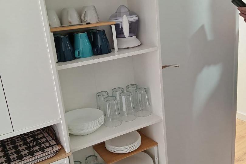 Cocina moderna y equipada con vitrocerámica, horno, dos neveras, microondas, lavadora y menaje.