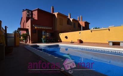 Casa adosada esquinera y orientada al sur y con vista al mar en Creixell., a 650 metros de la playa de Creixell. La casa está en buen estado de conservación, es esquinera por lo que cuenta con ventanas y espacio a sur, este y norte. Son 165 m2 construidos en un terreno de 200 m2 y se distribuye en la parte baja con espacio de patio y garaje cubierto con bodega, trastero y zona para la de la depuradora de la piscina. Subiendo 6 escalones está la planta baja con patio lateral y trasero donde encontramos la piscina que tiene escaleras y es de un muy buen tamaño como se aprecia en las fotos., zona de barbacoa y acceso directo a la cocina, justo es aquí donde está el toldo y donde se pone la mesa para estar tranquilamente a la sobra de frente a la piscina. A la casa se accede tanto desde la cocina, como desde la puerta principal que se encuentra en el lateral. Entrando encontramos el recibido., un cuarto de baño completo con plato de ducha, la cocina cuadrada y amplia y el salón comedor que como se aprecia en las fotos es muy amplio. En la planta primera encontramos una habitación doble con armario empotrado y terraza desde donde se ve también el mar. Un cuarte de baño amplio con bañera, una habitación doble con armario empotrado y una habitación doble mas grande también con armario empotrada y gran ventanal con vistas a horizonte y mar. La casa esta edificada en el año 2003, cuenta con verjas de seguridad, chimenea, calefacción y aire acondicionado por conducto en la planta primera y con Split en la planta baja, ventanas de aluminio y persianas todo en buen estado de conservación. A 600 metros de la playa, a 65 kilómetros de Barcelona y a 15 kilómetros de Tarragona, capital de provincia. Bien comunicada y al lado de todo. Es una casa perfecta tanto para vivir todo el año, como para segunda residencia.