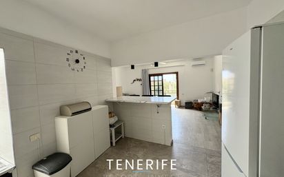 En el centro de Valle San Lorenzo, Arona: piso de 93 m² en primera planta con cocina americana abierta al salón, isla con barra de efecto mármol, aire acondicionado y balcón exterior.