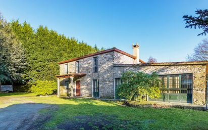 Esta propiedad se encuentra en Toques, a 8 minutos de Melide y 47 km del aeropuerto de Santiago de Compostela. La finca cuenta con 3.346 m² de terreno completamente cerrado por un seto de grandes árboles que garantiza privacidad. La vivienda es una casa de piedra de dos plantas en buen estado de conservación, lista para entrar a vivir y que se vende completamente amueblada. Cuenta con buen acceso directo desde la carretera. La planta baja incluye un amplio recibidor con escalera de madera y barandilla de forja, un salón-comedor de grandes dimensiones con chimenea, techo de madera con vigas vistas y amplios ventanales, una cocina completamente equipada con zona de comedor, un cuarto de baño completo con ducha y bidé, y una amplia galería acristalada con salida directa al jardín. La planta superior alberga un recibidor-distribuidor y tres dormitorios —dos de matrimonio y uno con dos camas individuales—, todos con suelo y techo de madera, y un cuarto de baño completo con bañera y dos lavabos. La propiedad incluye un anexo cubierto para aparcamiento y una construcción independiente de piedra destinada a almacén. Dispone también de zona exterior con mesa y bancos.