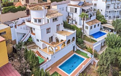Encantadora villa independiente con vistas al mar en Benalmádena Esta espaciosa villa es perfecta para aquellos que buscan una ubicación tranquila pero céntrica en Benalmádena. La planta principal consta de una cocina abierta y salón con vistas a la montaña y al mar, proporcionando un ambiente luminoso y acogedor. En la planta inferior, se encuentran 3 dormitorios. Uno con baño en suite y lavadero independiente. Otro con su propia terraza de 20 m², ideal para relajarse o disfrutar del sol. Un baño adicional y una habitación extra que puede utilizarse como oficina en casa, sala de juegos o espacio adicional, ofreciendo flexibilidad para diversas necesidades. Además, la propiedad incluye un apartamento estudio independiente, perfecto para invitados o como unidad de alquiler. El área exterior cuenta con varias terrazas amplias, una gran piscina privada y algo de vegetación con plantas y árboles alrededor de la parcela, creando un agradable espacio al aire libre. La propiedad también dispone de dos garajes cerrados con espacio de almacenamiento y aparcamiento adicional en la calle frente a la casa. Aunque la villa tiene varios niveles y escaleras, ofrece una excelente relación calidad-precio en una zona tranquila, a solo unos minutos en coche de la autopista A7. El Aeropuerto de Málaga está a solo 15 minutos en coche, y hay supermercados como Lidl y Mercadona, el campo de golf de Benalmádena y hospitales locales y privados cercanos.