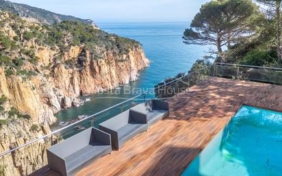 Terraza y piscina elevadas frente al mar en Aiguablava: una casa donde las vistas forman parte de tu día a día. Vivienda unifamiliar con 5 dormitorios y garaje Frente al mar en Aiguablava, esta vivienda unifamiliar ofrece 276 m² construidos sobre una parcela de 1.215 m². Se distribuye en 3 plantas y cuenta con 5 dormitorios, 5 baños y un aseo. Construida en 1978 y reformada interiormente, integra garaje cerrado en la edificación y dispone de lavadero y trastero. Terraza principal con piscina frente al mar La terraza principal, de aproximadamente 140 m², se sitúa frente al mar y conecta directamente con el salón mediante grandes puertas correderas acristaladas, con vistas abiertas al mar y a la ladera opuesta. La piscina rectangular, ubicada sobre plataforma tipo deck con barandilla acristalada, mantiene esa misma vista también desde el agua. Los 140 m² permiten colocar mesa de comedor exterior y tumbonas junto a la piscina. Planta principal abierta y tres dormitorios en suite La planta principal integra salón, comedor y cocina con isla central en un único espacio abierto, con salida directa a la terraza mediante puertas correderas acristaladas. El salón incorpora chimenea y en este mismo nivel se ubica un baño. Desde aquí, la escalera interior con peldaños macizos y barandilla de vidrio conduce a las plantas inferiores, donde se distribuyen cuatro dormitorios, tres de ellos con baño en suite. Algunos dormitorios cuentan con vistas abiertas al mar y disponen de armarios empotrados. Climatización, acabados y estado actual Construida en 1978 y reformada interiormente, la vivienda presenta acabados actualizados y buen estado general. Dispone de aire acondicionado mediante unidades tipo split y calefacción por radiadores. Las carpinterías exteriores son de aluminio en color oscuro con doble acristalamiento y grandes correderas en la zona principal. En el interior se utilizan pavimentos cerámicos en tono claro tipo parquet, con carpintería interior lacada en blanco. Los baños están acabados con revestimiento pétreo de gran formato y duchas a ras de suelo, y la cocina, integrada con isla central, está equipada con placa de inducción, horno, microondas, frigorífico y lavavajillas. Ubicación en Aiguablava con buenas conexiones La vivienda se sitúa en la zona de Aiguablava, uno de los enclaves más reconocidos de Begur por la calidad de sus calas y su entorno marítimo. La playa de Aiguablava se alcanza en 4 minutos en coche y el centro de Begur en 10 minutos. En menos de 20 minutos se accede a Tamariu, Llafranc, Calella, Sa Tuna o Sa Riera, lo que permite elegir entre distintas playas según el día. Girona y su aeropuerto se encuentran aproximadamente a una hora, Barcelona y su aeropuerto a poco más de 1 hora 30 minutos, y la frontera con Francia a alrededor de 1 hora 15 minutos. Si estás valorando una vivienda unifamiliar en Aiguablava con terraza y piscina frente al mar, podemos ampliarte la información y coordinar una visita para que la conozcas con detalle.