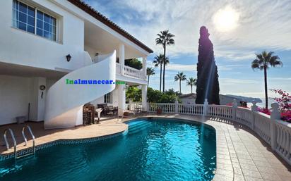 Encantadora villa con piscina en venta en La Herradura. Situada en una tranquila calle del residencial Las Palomas, esta en un entorno exclusivo y privado y muy cerca de todos los servicios esenciales que ofrece la Bahía de la Herradura. La propiedad se compone en la entrada principal de un amplio porche, una plaza de garaje cubierta con pérgola y un gran garaje cerrado. La propiedad se divide en dos plantas. En la planta principal nos encontramos con un salón comedor con chimenea de unos 60 m2 que se comunica con una terraza cubierta con unas fantásticas vistas a la Bahía de la Herradura. Es ideal para cenar al aire libre para recibir a amigos y familiares. La cocina es totalmente equipada con lavadero. Hay dos amplios dormitorios y un baño completo. En la planta baja con entrada independiente desde el exterior de la entrada principal y también por unas escaleras desde la zona de piscina, nos encontramos un gran salón comedor con una cocina abierta totalmente equipada. Hay 2 dormitorios muy amplios con 2 baños, zona de sauna y aseo y una habitación para lavandería. En la zona de exterior encontramos una hermosa piscina muy soleada durante todo el día y unos magníficos jardines con algunos árboles maduros. Con su combinación de características espectaculares, esta villa en venta representa la casa familiar perfecta, la segunda residencia o la inversión para alquilar en la prestigiosa pueblo de La Herradura en la costa Tropical de Granada. Si necesita más información o visitar esta vivienda puede contactar con nosotros: Inalmunecar.com