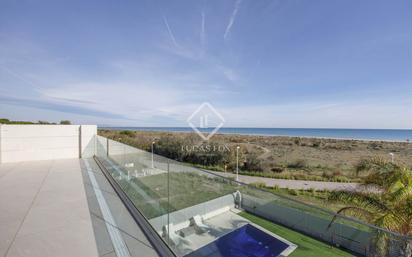 Este chalet de excelentes condiciones en primera línea de playa de Almardá, es una oportunidad única por sus características y sobre todo por su exclusiva ubicación, dado que chalets de primera línea salen muy raras veces al mercado. Entramos a la vivienda por un amplio recibidor o bien hall de entrada abierta hacía el salón-comedor. El salón-comedor amplio y luminoso con su cocina abierta e integrada con isla nos crea un gran espacio que a su vez nos da un acceso directo a la terraza cubierta con zona lounge, zona para comer y el jardín con su piscina equipada con sistema clorador-salino. En esta misma planta también encontramos un lavandero, un dormitorio pequeño y un baño completo con ducha. Subimos por la escalera a la primera planta. Nada más subir a esta zona de noche encontramos a mano derecha el primer dormitorio doble con baño en suite. Girando hacía la izquierda encontramos otros dos amplios dormitorios con vistas panoramicas al mar y con un baño completo a compartir, pero con acceso directo desde ambos dormitorios. Siguiendo el pasillo llegamos al gran dormitorio principal con vestidor integrado y con su amplio baño en suite equipado con ducha, así como bañera. Si subimos una planta más, nos encontramos con un espacio amplio y luminoso actualmente usado como despacho y gimnasio y que también dispone de un acceso a una gran terraza con unas vistas despejadas y panoramicas a la playa con sus dunas y al mar. El exterior de la vivienda dispone de un jardín práctico de bajo mantenimiento con piscina rectangular de 10m x 4m equipado con sistema clorador-salino, varias terrazas, una cocina exterior, dos trasteros y como punto destacable, el acceso directo a la playa que encontramos justo delante. También vale la pena saber y destacar que este chalet está equipado con el sistema de aerotermia, suelo radiante, aire acondicionado por conductos (frío/calor), sistema descalcificador para el agua, ventanas de seguridad y dispone de un gran sistema de seguridad con alarma y circuito de cámaras cableado. En el caso de estar interesado en recibir más información o en hacer una visita, no dude en ponerse en contacto con nosotros.