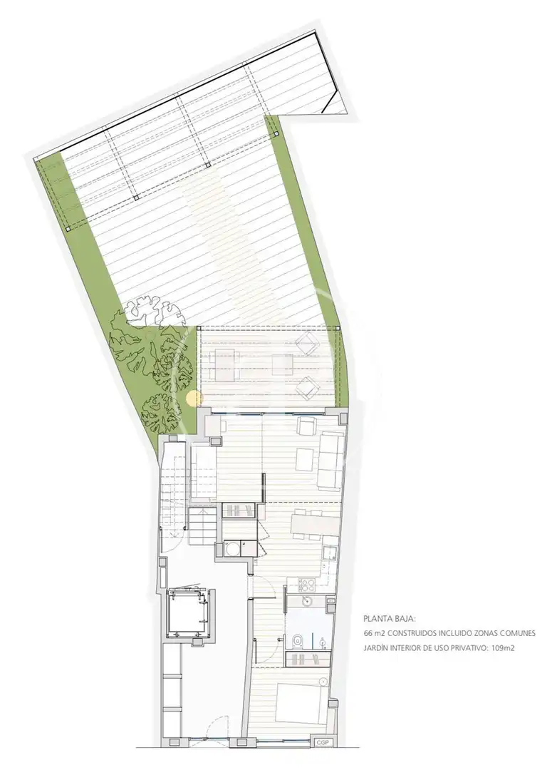 Queda disponible impecable vivienda totalmente equipada, ubicada en planta baja con jardín privado de 100m2, distribuida en salón comedor con cocina abierta y acceso al jardín, dos habitaciones dobles y un baño completo, y cuarto para lavadora.