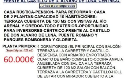 DOS PLANTAS: Primera: 120 m2, cuarto de baño, cocina, tres dormitorios, salón, recibidor, cuarto de star, despensa. TERRAZA CUBIERTA DE 120 M2 CON VISTA AL RÍO ARENAL. Precio 60.000€. Segunda: 120 m2 distribuida provisionalmente. Precio 15.000€. LOTE DOS PLANTAS ... 75.000€