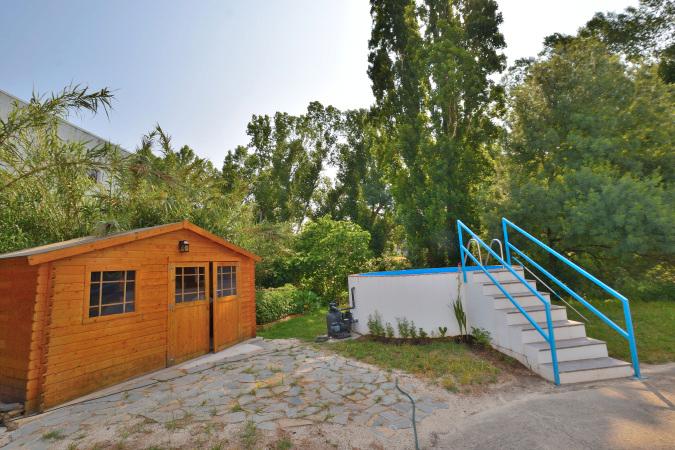 La terraza ofrece vistas al jardín y a la piscina, creando un espacio perfecto para relajarse. Además, cuenta con un aseo y trastero, así como una pequeña casita de madera que puede servir como habitacion o espacio adicional.