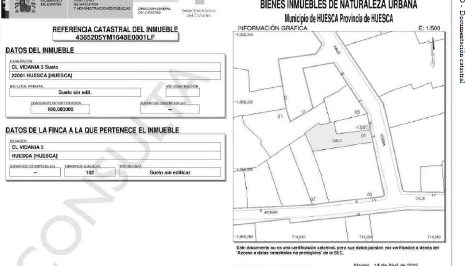 Solar de uso residencial en Huesca, provincia de Huesca, de tipología plurifamiliar con una superficie de 102 m², con edificabilidad estimada de 329 m² y un número estimado de 4 unidades a edificar. El de propiedad que se posee en la finca registral es del 100. La edificacion previa se encuentra demolida con apantallamientos ejecutados sobre las fincas colindantes y grua torre sin retirar de la parcela. Parcela localizada en el casco historico con acceso a traves de calle estrecha de unos 3 metros de ancho en zona de nivel de tránsito bajo y con escasez de zonas de aparcamiento. La futura edificación esta afectada por la aparición de restos arqueológicos que deben ser conservados según resolución del año 2007; en el solar han aparecido restos de una antigua muralla y un acueducto. Entorno de edificaciones de la zona de reciente construcción con otras edificaciones de principios del siglo XX, algunos de ellas en muy mal estado. Se encuentra fisicamente unida a la parcela colindante, de mayor dimensión, formando entre ambas una parcela sobre la que habia comenzado la construcción de una edificación conjunta actualmente paralizada. Se ha realizado parte del movimiento de tierras y contención a base de un muro de hormigón. Parcela de forma irregular entre medianerías, alargada y con fachada únicamente a calle de situación.