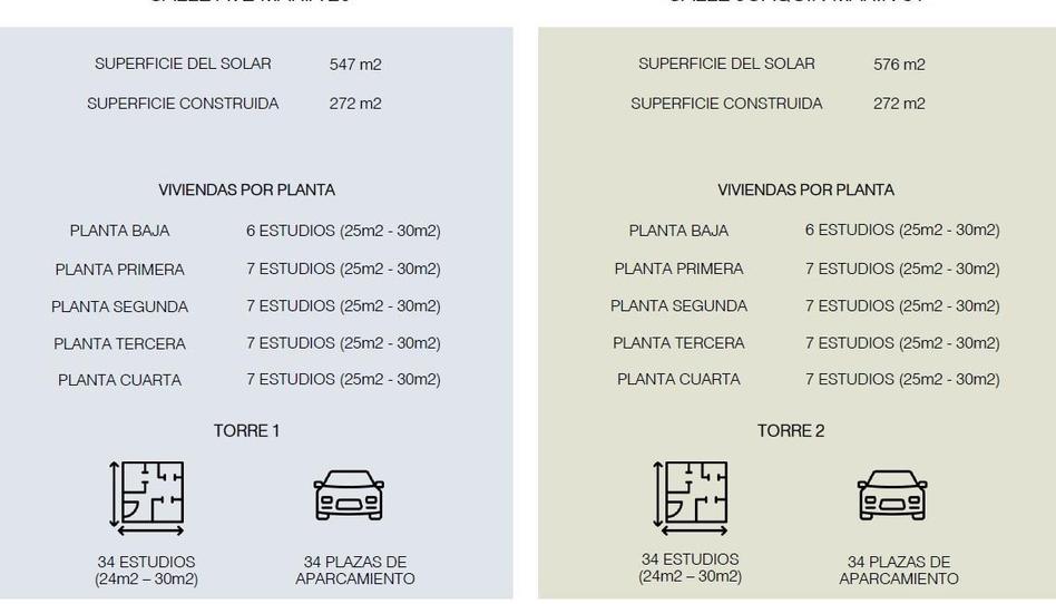 Ambas torres tienen la posiblidad de construirse en 5 alturas, planta baja más cuatro además de dos plantas de sótano. Sobre una superficie gráfica de 1123 metros, se pueden construir sobre cota rasante, 68 estudios y bajo rasante 68 plazas de garaje. Todos los estudios cuentan entre 24 y 30 m2.