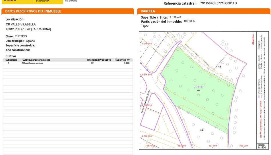 Suelo urbananizable no programado, su actual uso es rústico de cultivo agrario en Crta Vilabella, en el municipio de Puigpelat, provincia de Tarragona. Dispone de una superficie de 9.100 m2. La topografía natural del terreno es llana, con fachada a dos calles. Se trata un terreno urbano no consolidado. La caracterización rústica del suelo, es que se trata de una zona con desarrollo pendiente de finalizar, con una consolidación de nivel medio alto. Existe pavimentación, alcantarillado, suministro de agua, suministro de luz, existe suministro de gas por red general, dispone de postes de servicio telefónico, alumbrado público, la conservación de la calidad de las infraestructuras colindantes es de nivel medio.