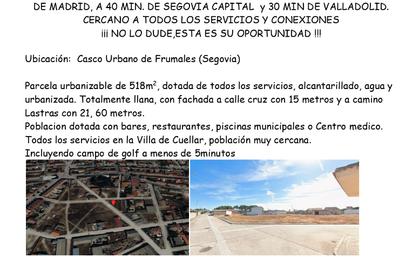 A la venta parcela urbana en Frumales, Segovia. Dispone además de todos los servicios agua, alcantarillado, telefonía, acerado, alumbrado público, viales hormigonados etc. Este municipio de la provincia de Segovia está situado muy cerca de Cuéllar, a poco más de media hora de Valladolid, y Segovia, 60 km. , y a 150 km de Madrid. Parcela urbanizable de 518m2, dotada de todos los servicios, alcantarillado, agua y urbanizada. Totalmente llana, con fachada a calle cruz con 15 metros y a camino Lastras con 21, 60 metros. Poblacion dotada con bares, restaurantes, piscinas municipales o Centro medico. Todos los servicios en la Villa de Cuellar, población muy cercana. Incluyendo campo de golf a menos de 5minutos 18.500€