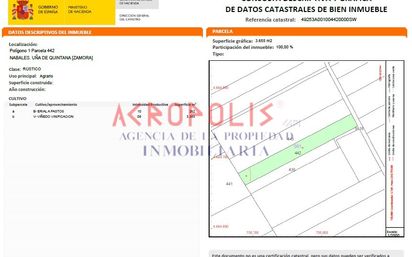 Suelo rústico de 3655 m² ubicado en Uña de Quintana, Zamora. Se trata de un suelo no urbanizable de 3655 m² de carácter rústico situado en el paraje Nabales, concretamente en el Polígono 1 Parcela 442. La parcela se encuentra en las afueras del núcleo urbano de la localidad. En la zona podemos encontrar pequeños comercios locales y servicios básicos. Además, la cercanía a la localidad de Zamora ofrece acceso a servicios adicionales como hospitales y centros educativos. Con nuestros servicios podrá encontrar el suelo rústico que necesita y asegurar su inversión con el mejor de los asesoramientos especializados. Empiece ahora mismo pidiendo más información. Un responsable cercano a usted le atenderá personalmente.