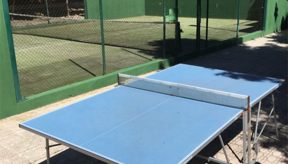Zonas ajardinadas, parque infantil con columpios y arenero, mesa de ping-pong