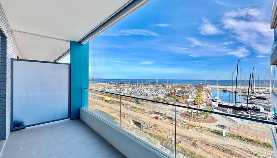 Esta vivienda tiene una superficie de 114 m² construidos y está formada por un salón comedor con salida a amplio balcón con vistas al mar y al Puerto de Badalona. La cocina independiente está equipada con gran cantidad de muebles de cocina y electrodomésticos (inducción, campana extractora, horno y microondas) y también tiene acceso al balcón.