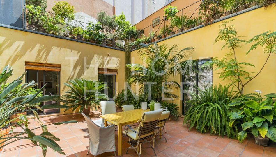 Este piso de 203m² repercutidos (158m² útiles de piso, 55m² de patio privado en planta baja y 36m² de terraza en planta alta. En la planta baja encontramos salón-comedor y cocina office independiente, ambos con salida a patio, habitación doble en suite con doble salida a patio y estudio/habitación individual. En la planta alta hay un estudio, habitación doble en suite y terraza. El piso cuenta con ventanas con doble acristalamiento, aire acondicionado, calefacción individual por radiadores, armarios empotrados y trastero. Tiene elementos originales como el techo con volta catalana, molduras y vigas. Se contruyó en 1751 aunque se rehabilitó en el 2000.