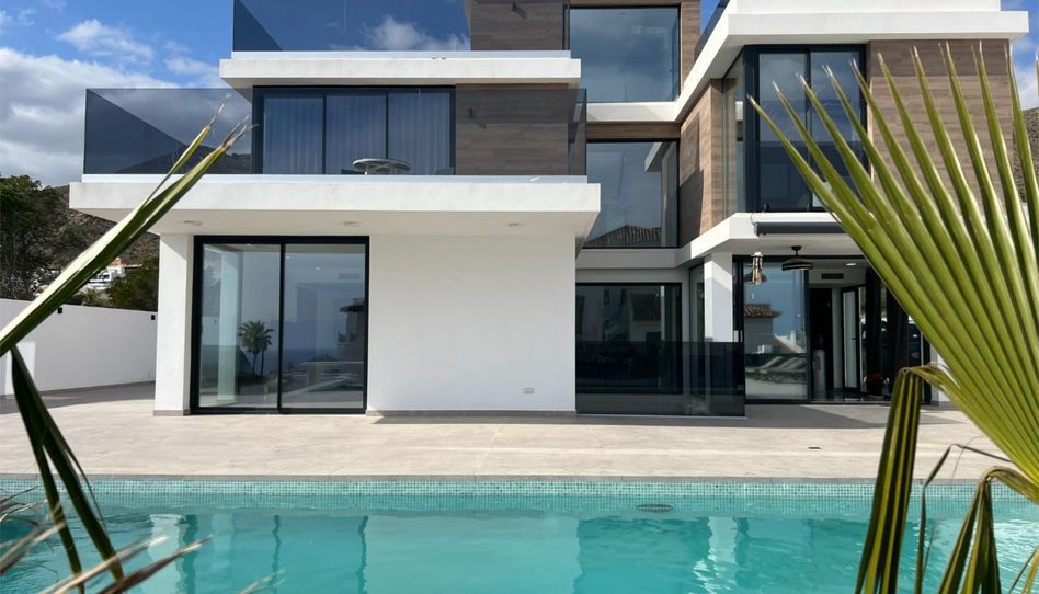 Villa de nueva construcción en Sierra Cortina con ascensor, piscina desbordante y terrazas con vistas panorámicas al mar y la montaña. La vivienda se ubica sobre una parcela de 700 m² y cuenta con aproximadamente 500 m² construidos distribuidos en tres plantas comunicadas por ascensor.