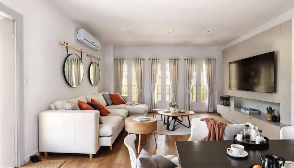 El salón independiente, muy luminoso gracias a sus dos ventanales, ofrece un espacio cómodo y acogedor para el día a día (La primera foto está generada por IA para ilustrar una posible decoración del espacio).
